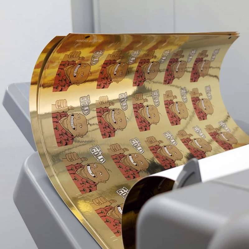 Due to the nature of the metallized substrate, CMYK printing is done directly on the film surface, giving the colors a metallic light-reflecting effect. White underprint is not used under CMYK colors, so the resulting colors differ from those printed on white paper – they are more transparent and react to the color and gloss of the film.